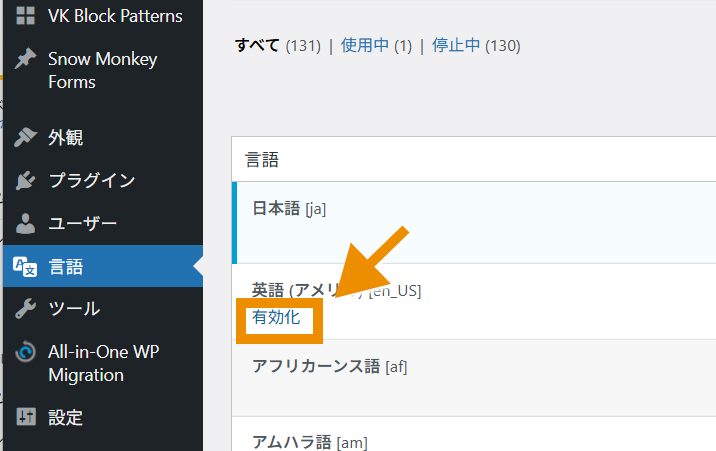 追加したい言語パックにカーソルを合わせ、「有効化」をクリックします。