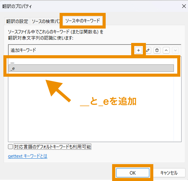 タブを「ソース中のキーワード」に切り替え、「+」アイコンより、追加キーワードとして「__」と「_e」を追加します。