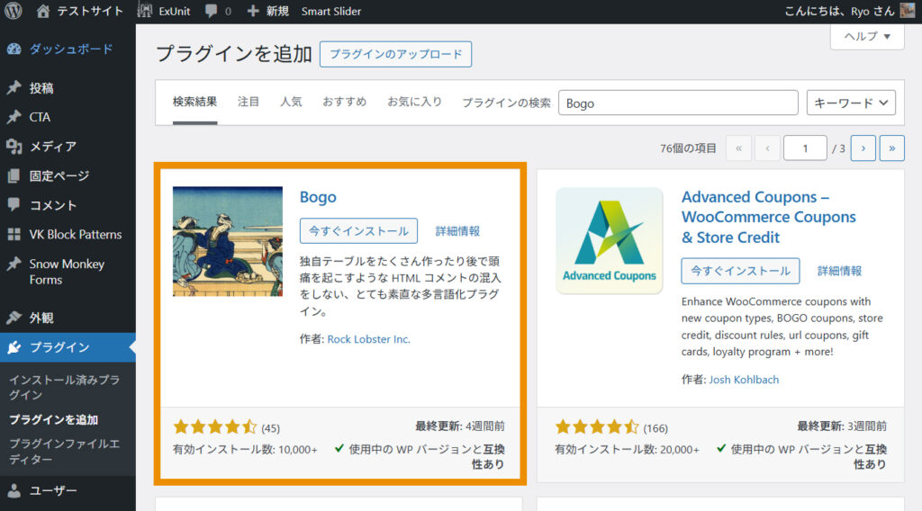 WordPressのプラグイン新規追加画面で「Bogo」と検索し、出てきたこちらのプラグインをインストール→有効化します。