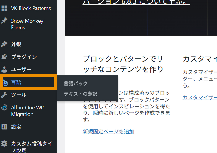 Bogoが有効化されると、サイドバー上に「言語」という項目が追加されます。