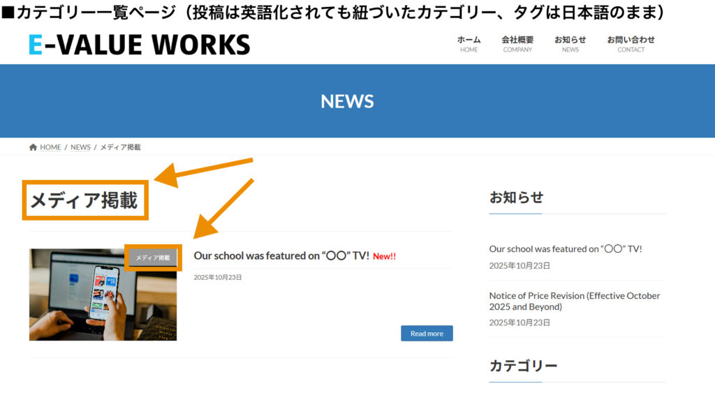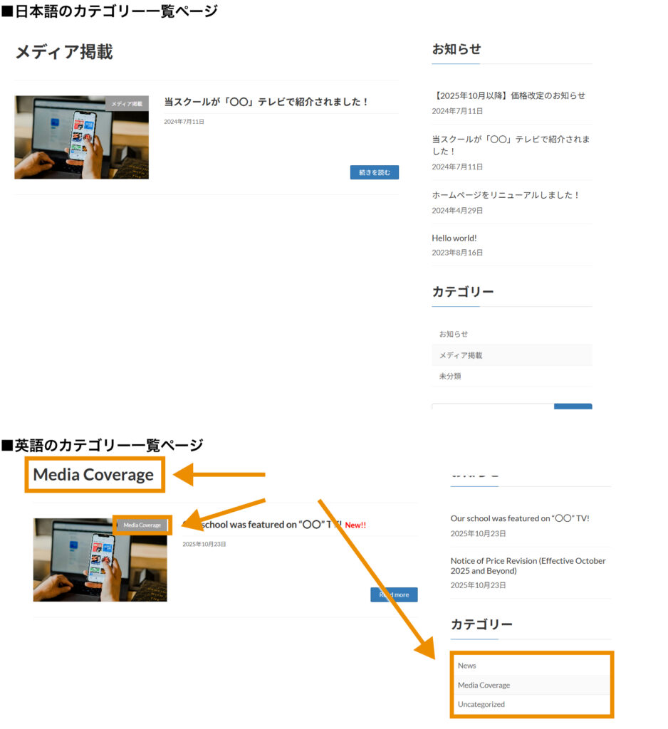 投稿を翻訳しても紐づいているカテゴリーは、日本語のまま表示されます。