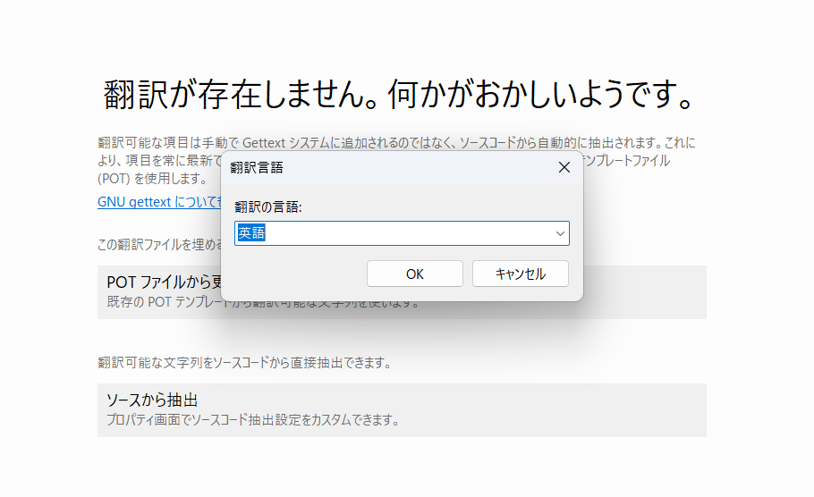 そうすると翻訳言語を指定する画面が表示されますが、今回は日本語をもとに英語の翻訳ファイルを作成したいので、「英語」を選択します。
