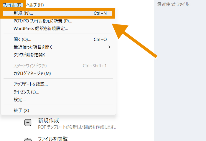 Poeditを使ってソースコード(.php など)から直接翻訳文字列を抽出する形で翻訳ファイルを作るには、「ファイル>新規」をクリックします。