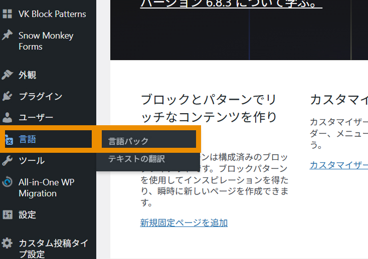 この仕組みにより、たとえば管理画面(ダッシュボード)の表示言語も、「設定>一般」の「サイトの言語」で指定した内容に応じて自動的に切り替わるようになっています。
