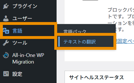 このカテゴリーやタグ名を翻訳したい場合は、WordPressのダッシュボードで「言語>テキストの翻訳」をクリックします。