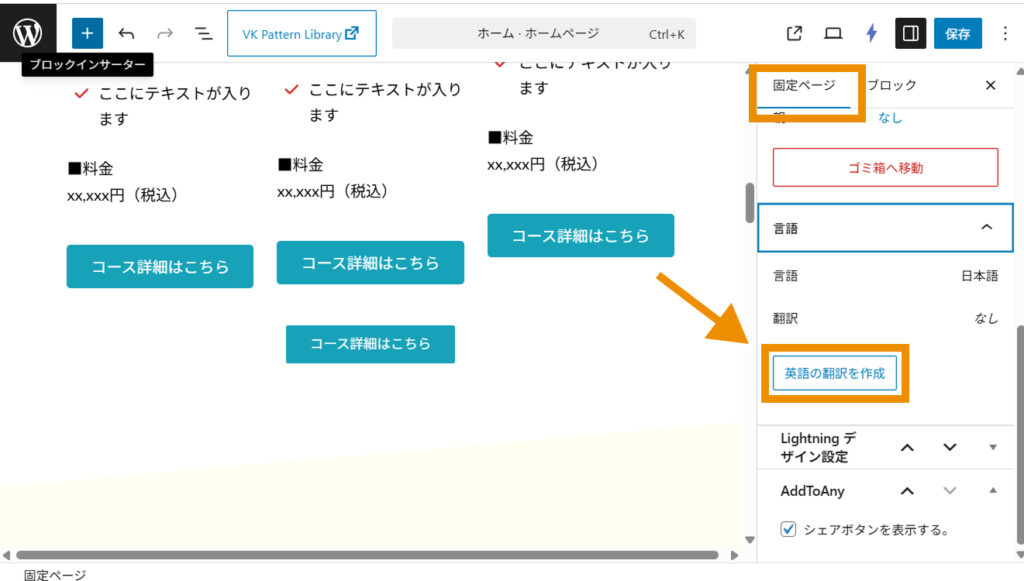すでに、日本語ページが存在する場合は、編集画面を開き、右サイドバー「言語」から「英語の翻訳を作成」をクリックします。