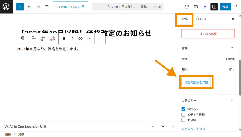 投稿ページを多言語化する際も固定ページと同様、すでに作成した投稿の編集画面から「英語の翻訳を作成」をクリックします。