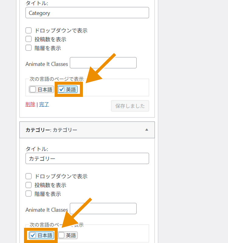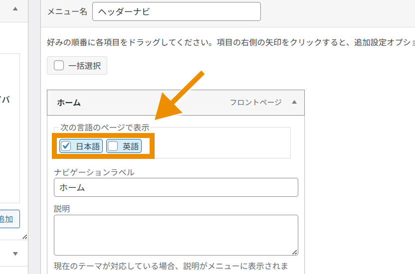 メニューの場合もウィジェット同様、メニュー追加時に「次の言語のページで表示」というチェックボックスが表示されます。