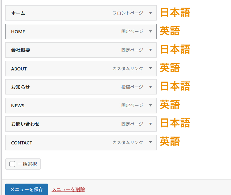 そのため、以下のように1つのメニューに日本語と英語のメニューを交互に追加します。