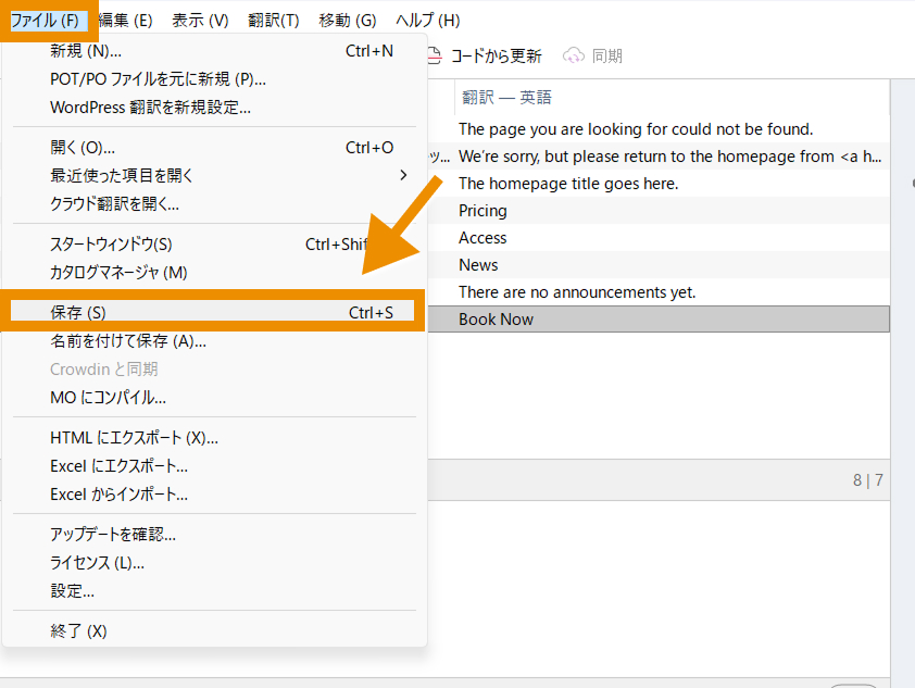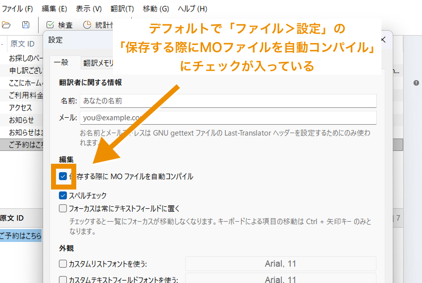 Poeditでは、poファイルを保存するとデフォルトで自動的に対応するmoファイルがコンパイルされる設定になっているため、これでpo/moファイルの作成ができました。
