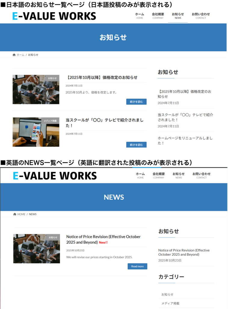 なお、Bogoではデフォルトで、日本語のお知らせ一覧ページには日本語の投稿一覧が、英語のお知らせ一覧ページには英語に翻訳された投稿一覧が表示されます。