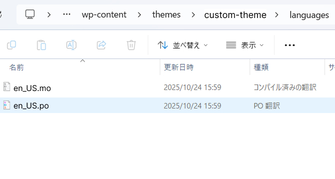 例えば、英語の場合はロケール名が「en_US」なので、en_US.po / en_US.moのように命名しましょう。