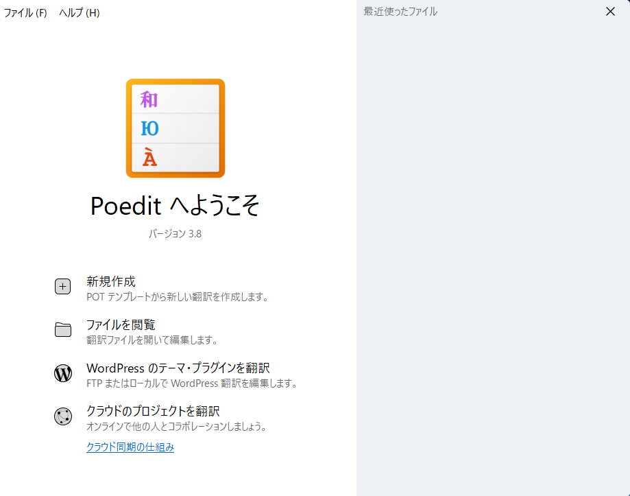 インストールが完了すると、Poeditが開き「Poeditへようこそ」と書かれた画面が表示されます。