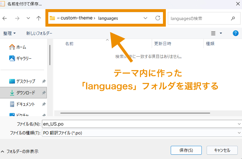 保存先にはSTEP. 2で作成した「languages」フォルダを指定し、保存します。