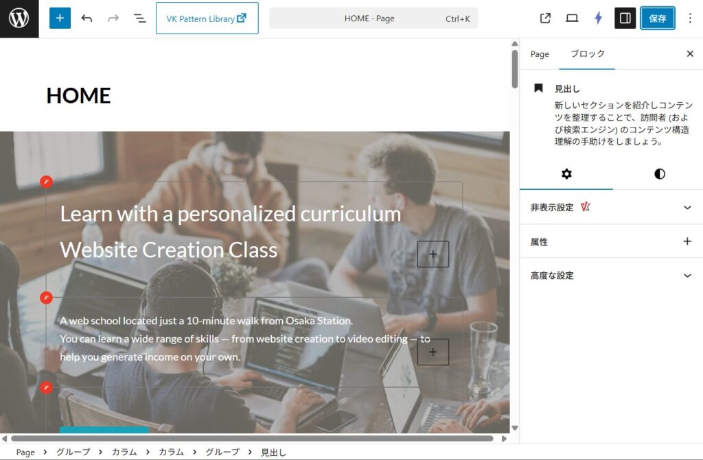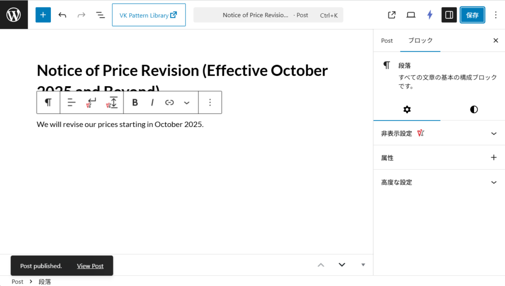 そうすると、英語ページ用に複製された固定ページ編集画面が開くので、あらかじめ用意しておいた英語原稿を使って内容を編集し、英語ページとして仕上げていきます。