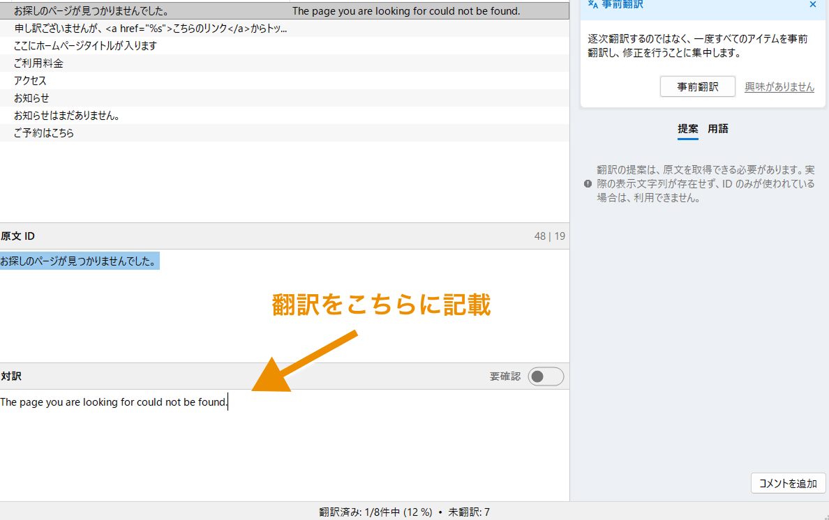_e( 'こんにちは', 'e-valueworks' );先ほどの例では、404ページのテキストを翻訳用の関数で囲っていきましたが、同じように他のテンプレートファイルでも、テキスト部分を囲っていきましょう。