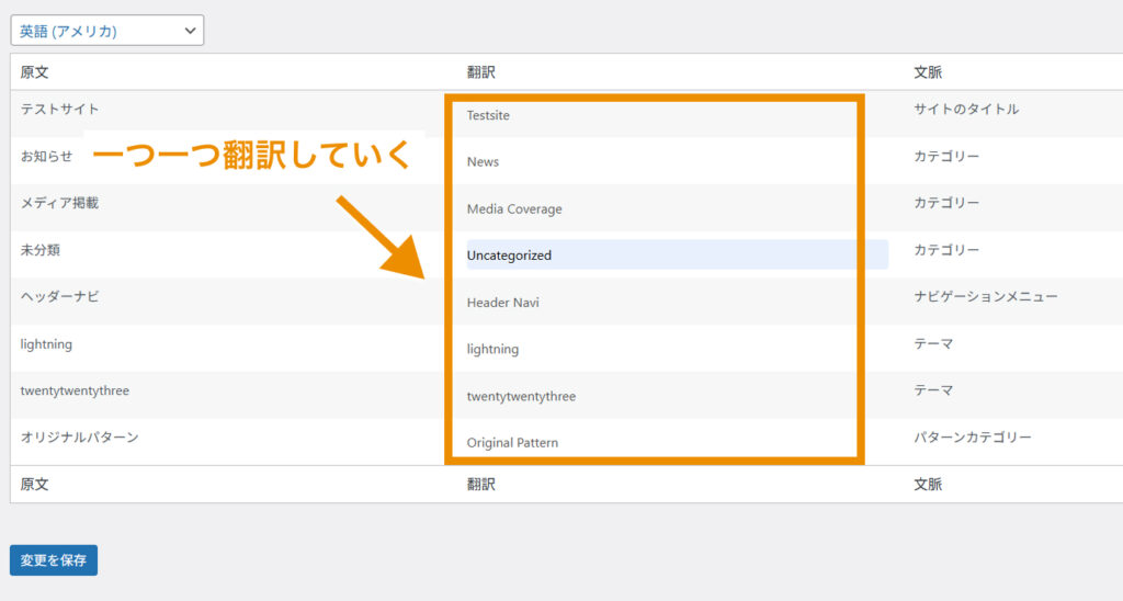 ここからサイトのタイトルやカテゴリー、タグ等の翻訳ができるのでそれぞれ翻訳し、「変更を保存」をクリックします。