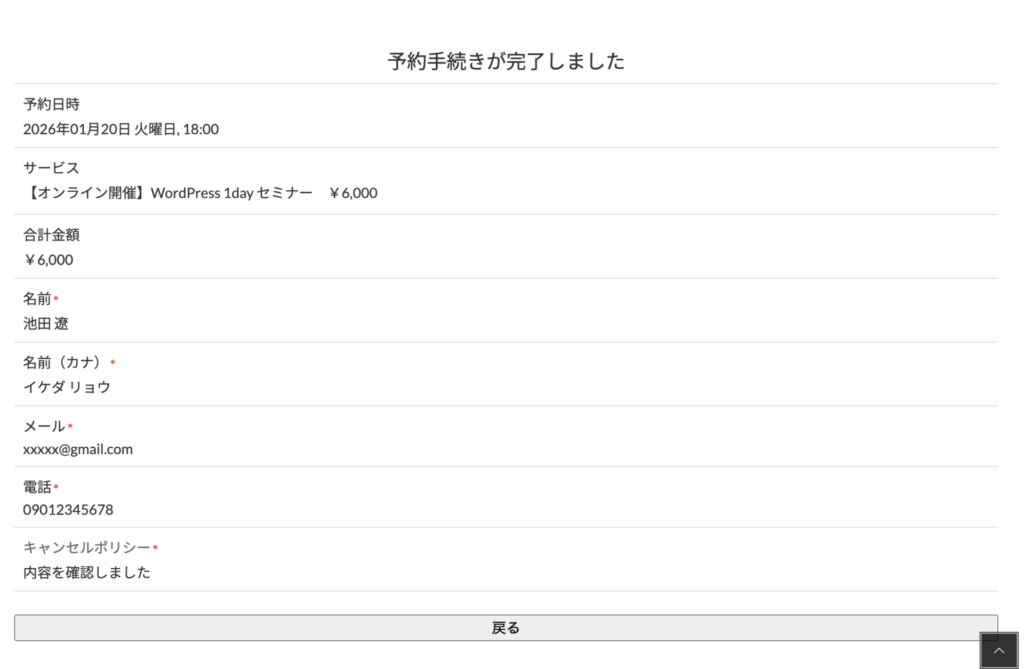 これで、予約完了時に設定した固定ページを表示させることができます。