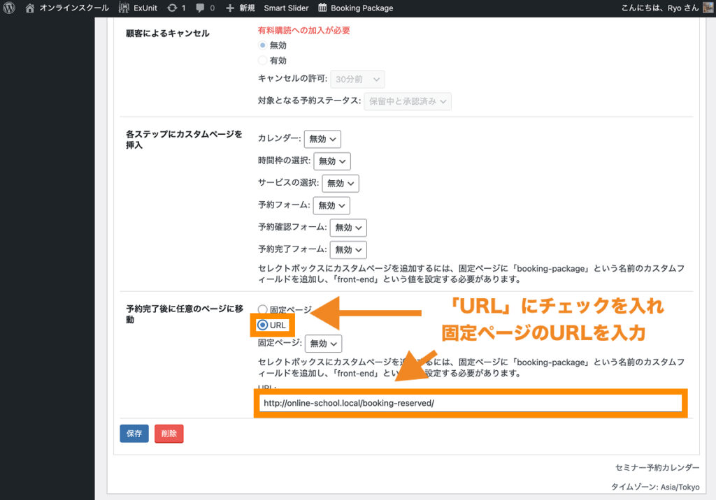 下にスクロールしたところにある「予約完了後に任意のページに移動」箇所で、「URL」にチェックを入れ、予約完了後に表示させたい固定ページのURLを入力します。