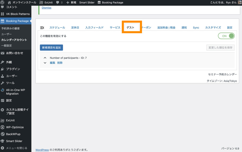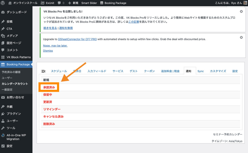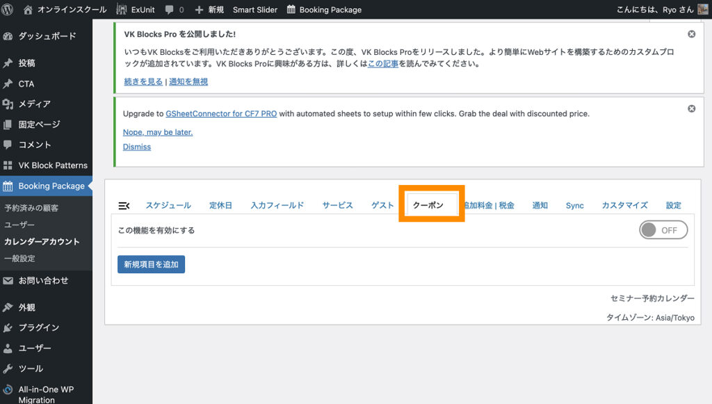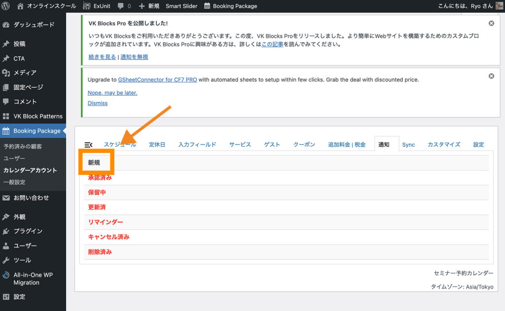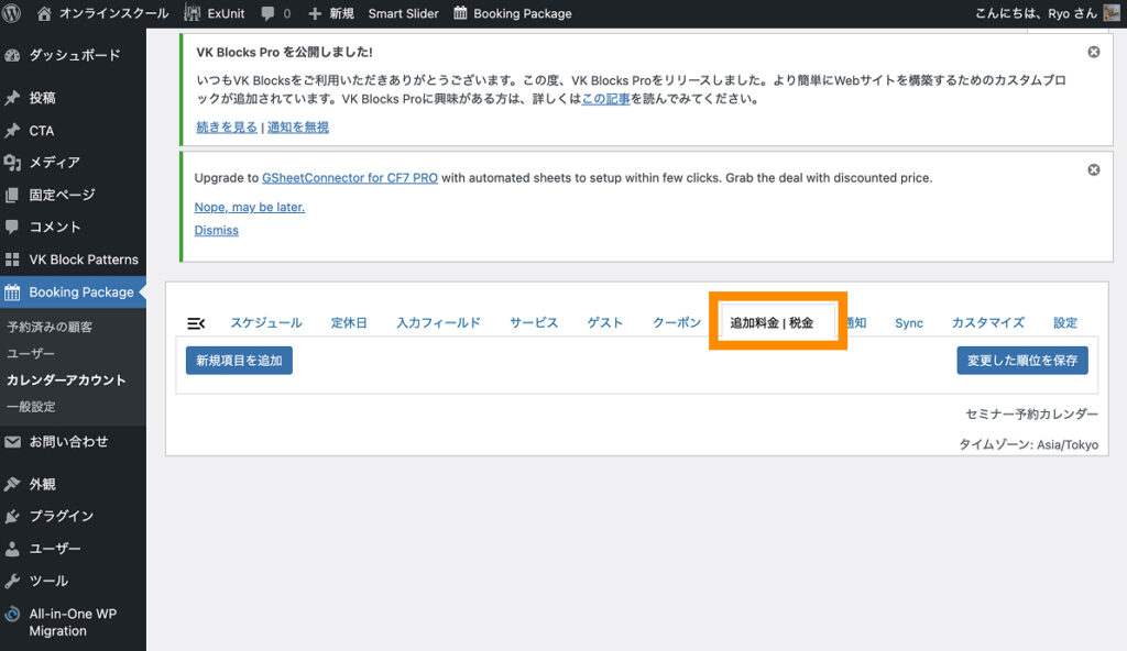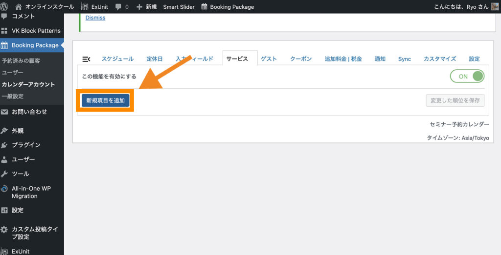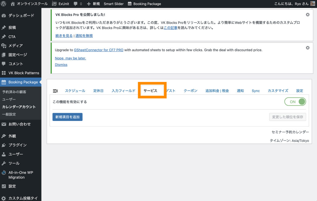 Booking Packageが正しくインストール&有効化できていると、左サイドバー上に「Booking Package」と書かれた項目が追加されます。