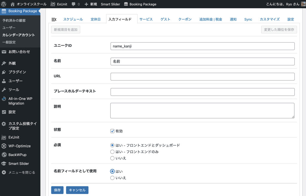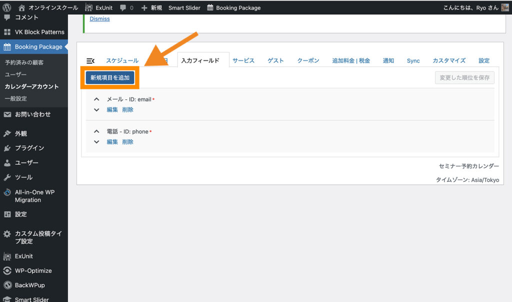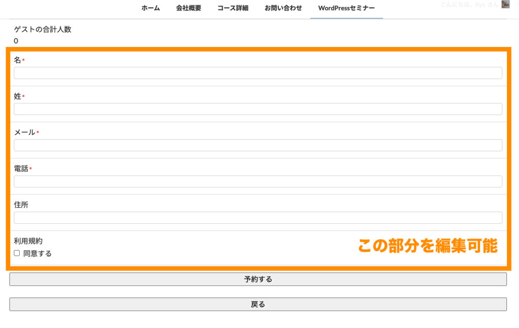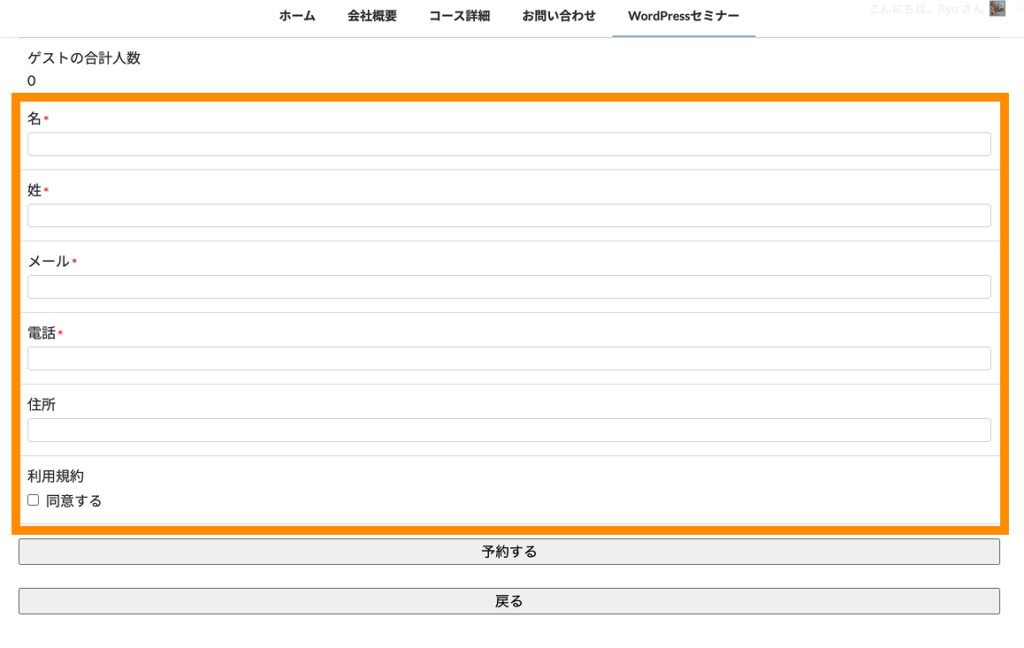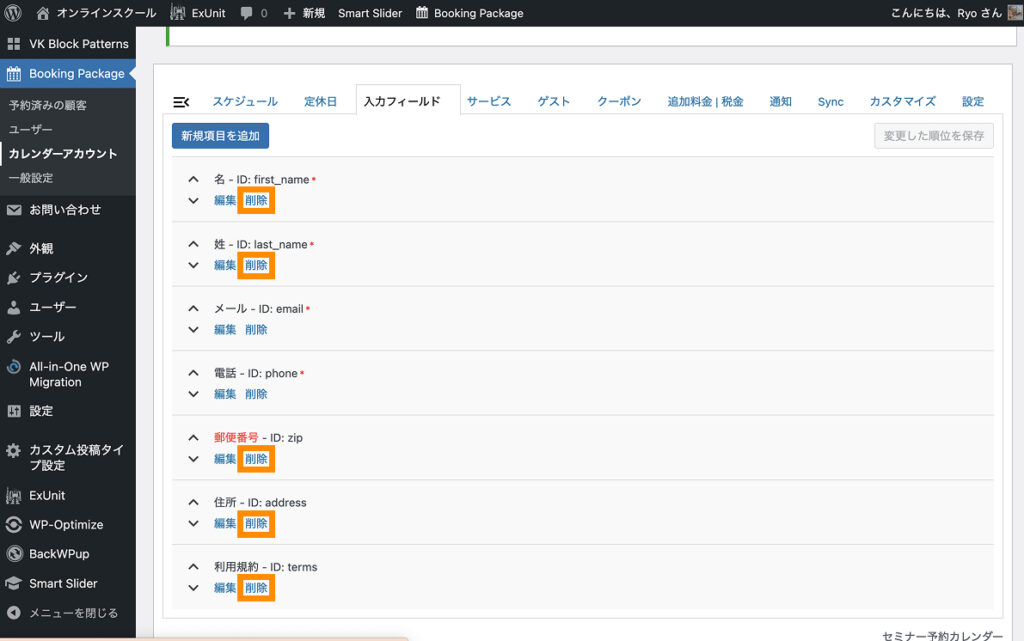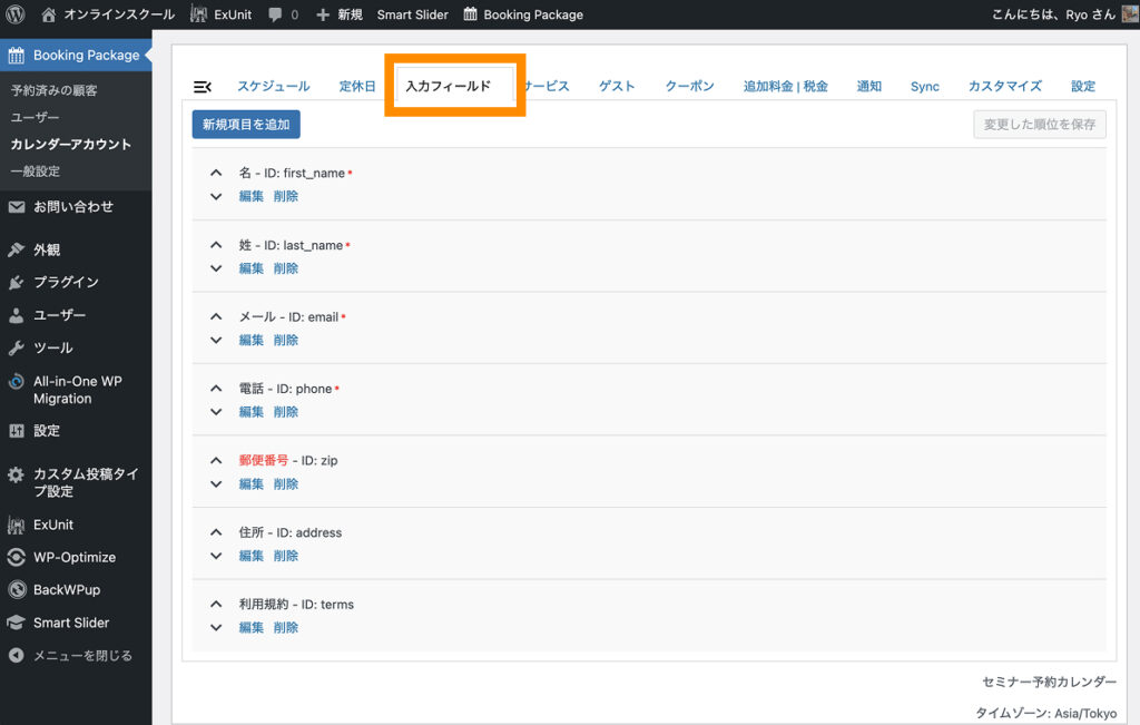 最後に、入力フィールドの順番だけ「名前」「名前(カナ)」「メール」「電話」「キャンセルポリシー」と並ぶように調整しておきます。
