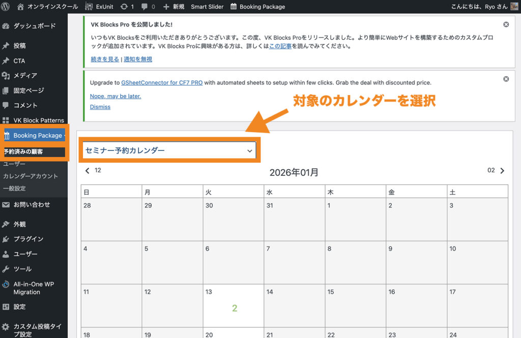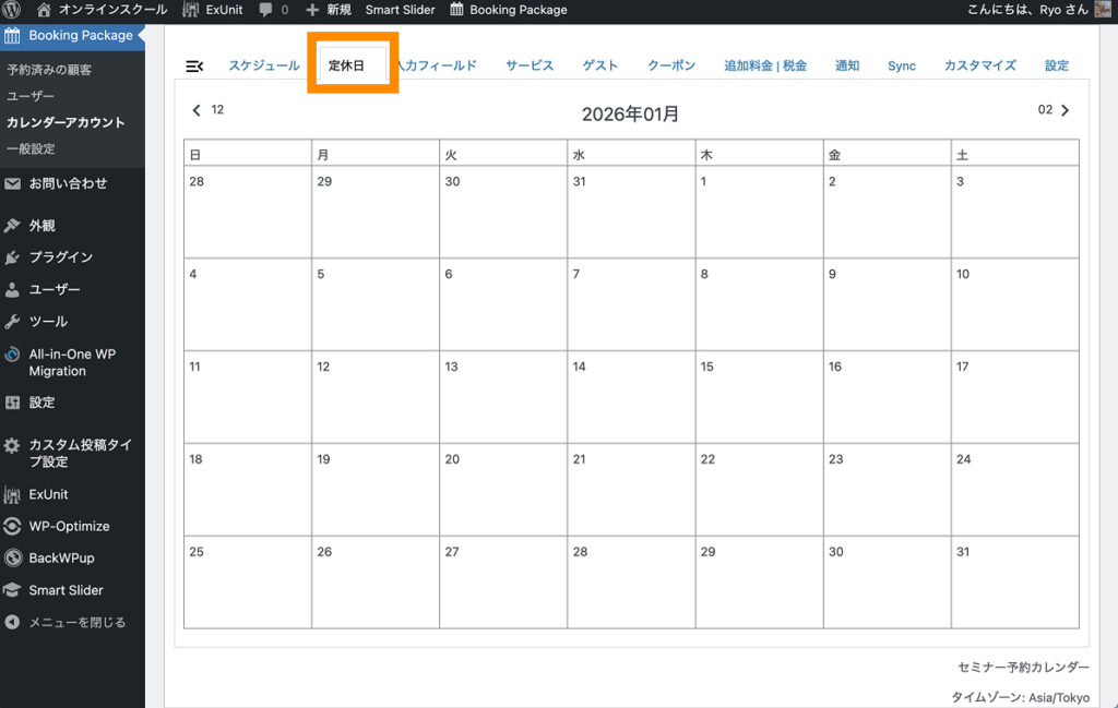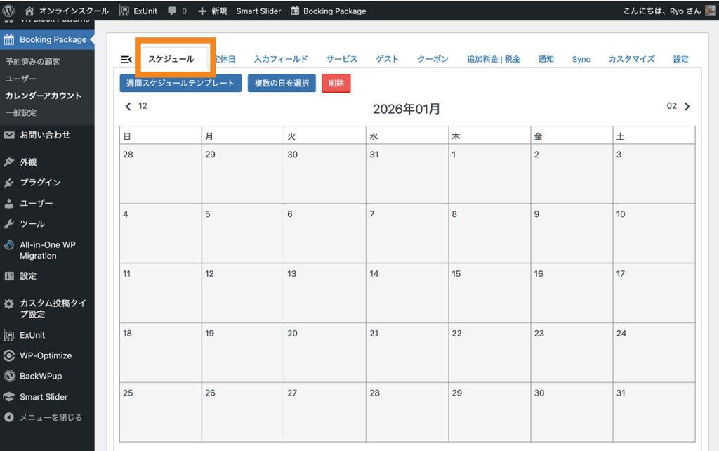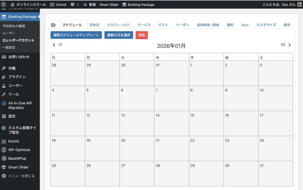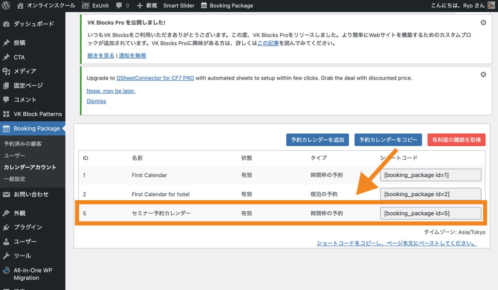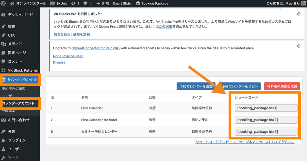 カレンダーの埋め込みには「Booking Package>カレンダーアカウント」画面に記載のショートコードを使用します。