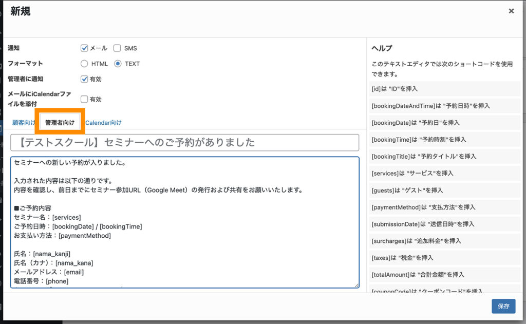 カレンダーからの新規予約があった際のメール本文は、「新規」から設定します。