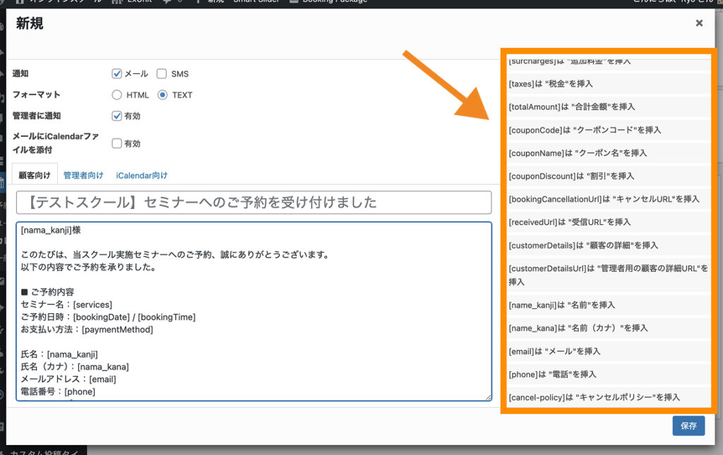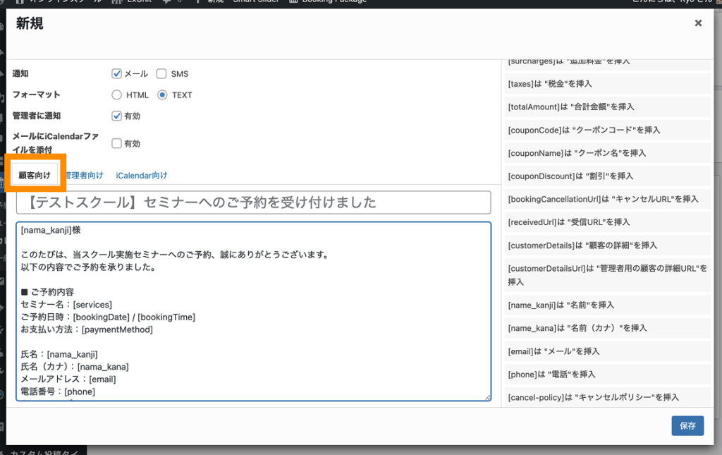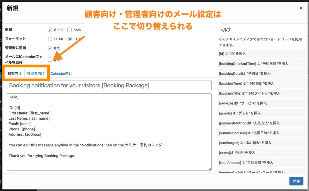 「顧客向け」「管理者向け」のメール本文は、それぞれ上のタブから切り替えられます。
