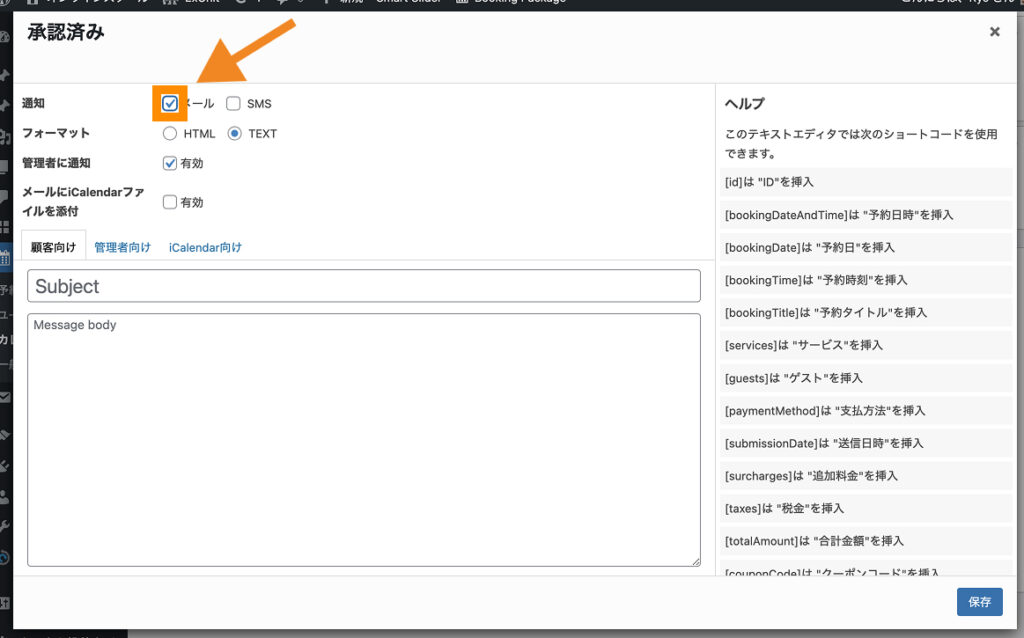 予約承認時のメール本文は、「承認済み」から設定します。
