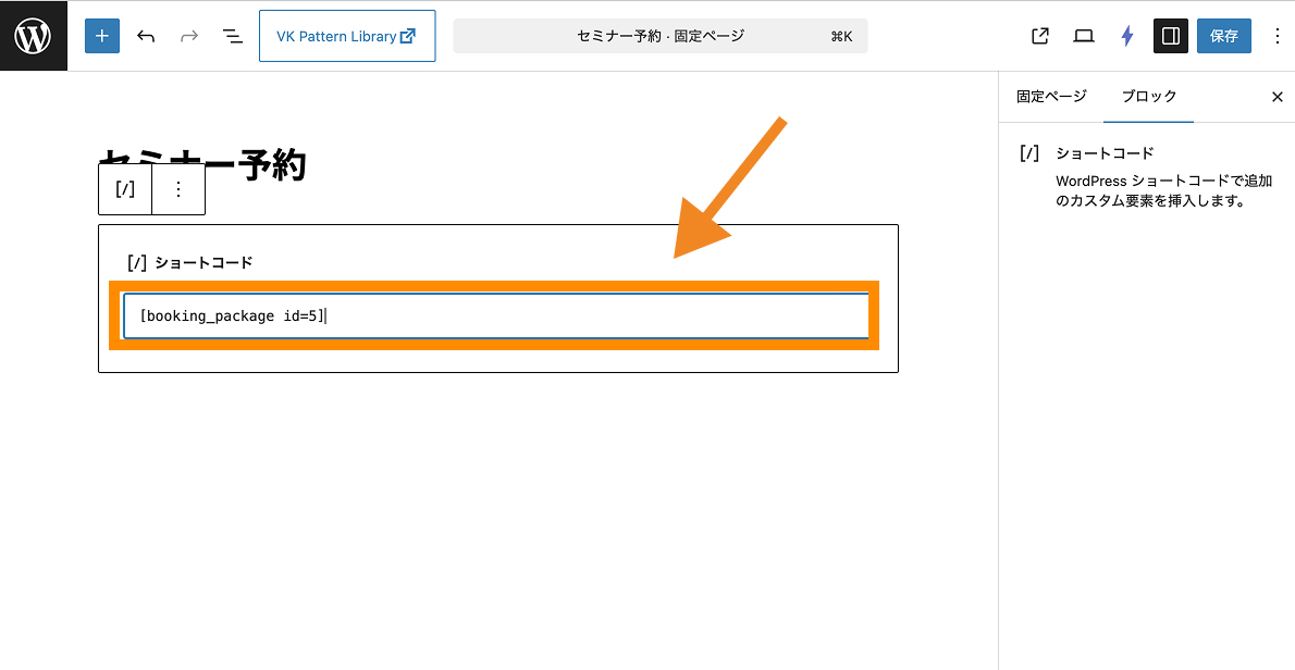 予約カレンダーを表示したい固定ページを開き、ショートコードブロックを使ってカレンダー用ショートコードを貼り付けます。