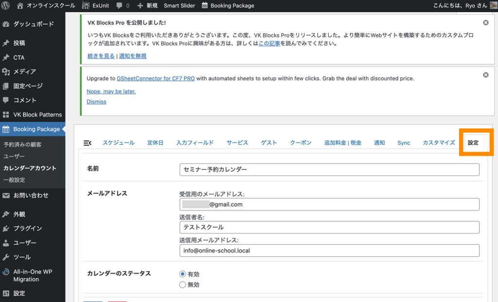 設定タブでは、予約カレンダーからフォームが送信された際に通知を受け取るメールアドレスや、送信者名などの設定を行います。