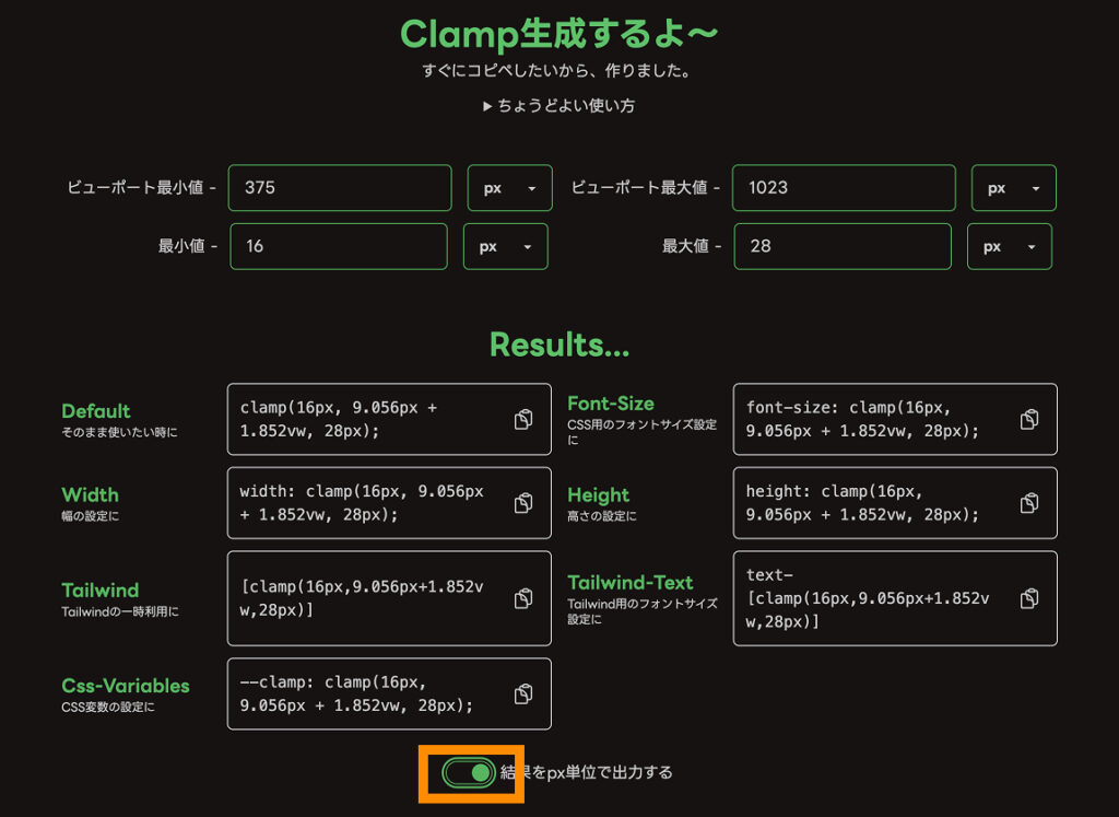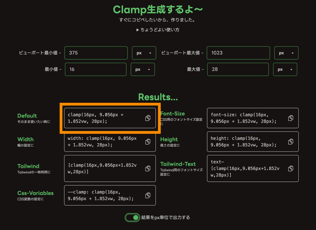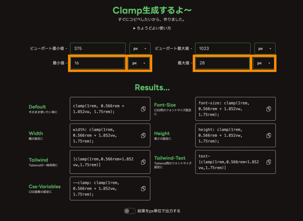 clamp関数ジェネレーターを使うことで、特定のウィンドウサイズ間で最小値と最大値を指定し、その間の幅では値が滑らかに変化するフォントサイズを簡単に算出できます。