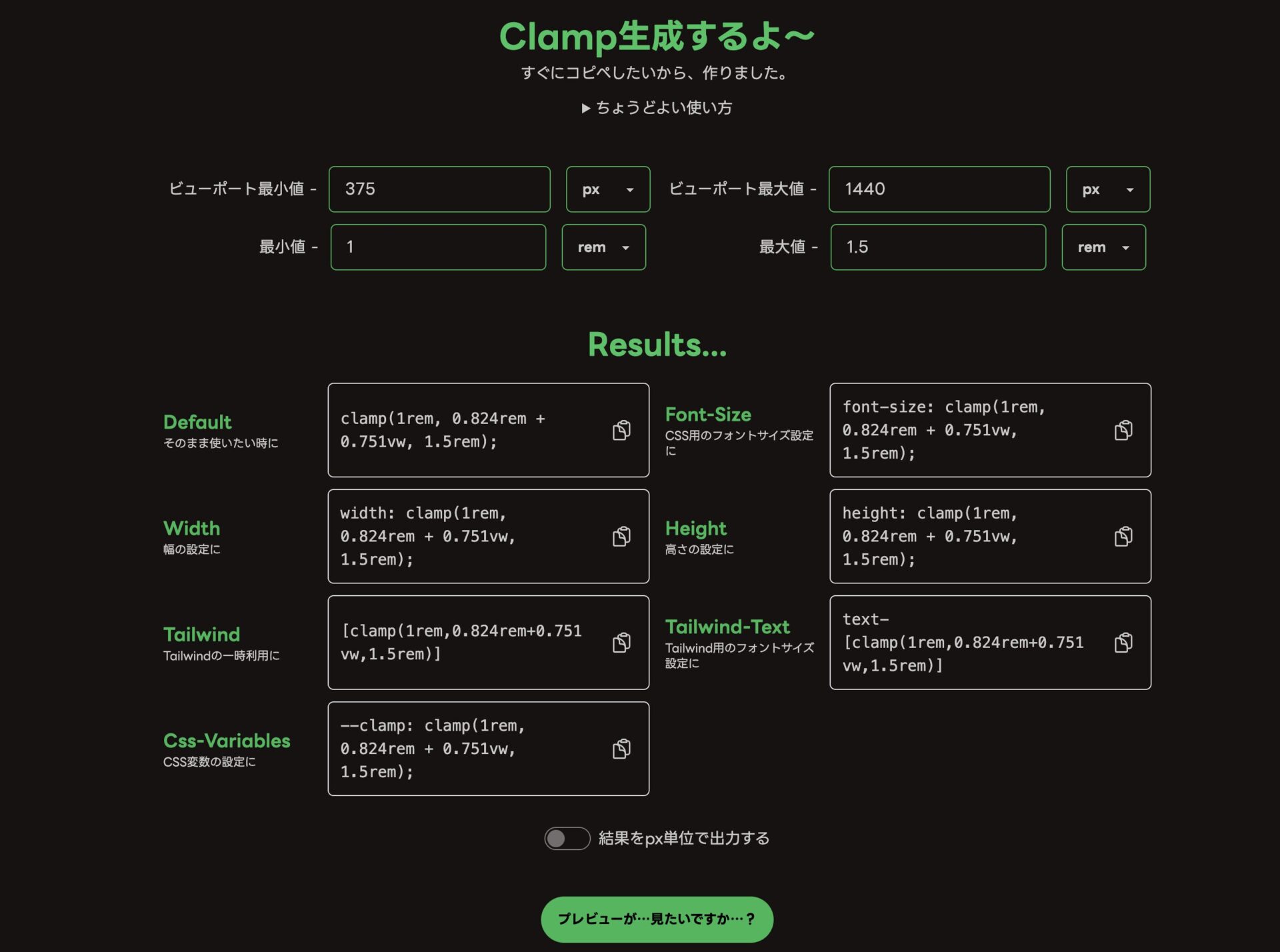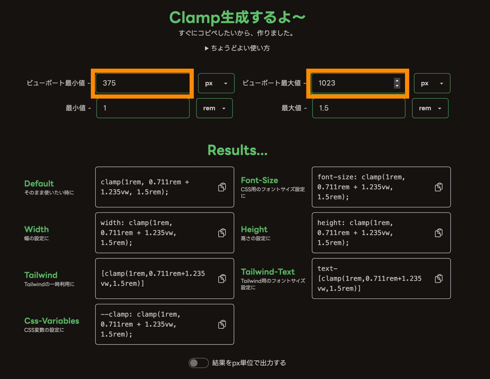 最後にResultsに生成されている値の中の単位が「rem」のままのため、「結果をpx単位で出力する」にチェックを入れて、pxに変換します。