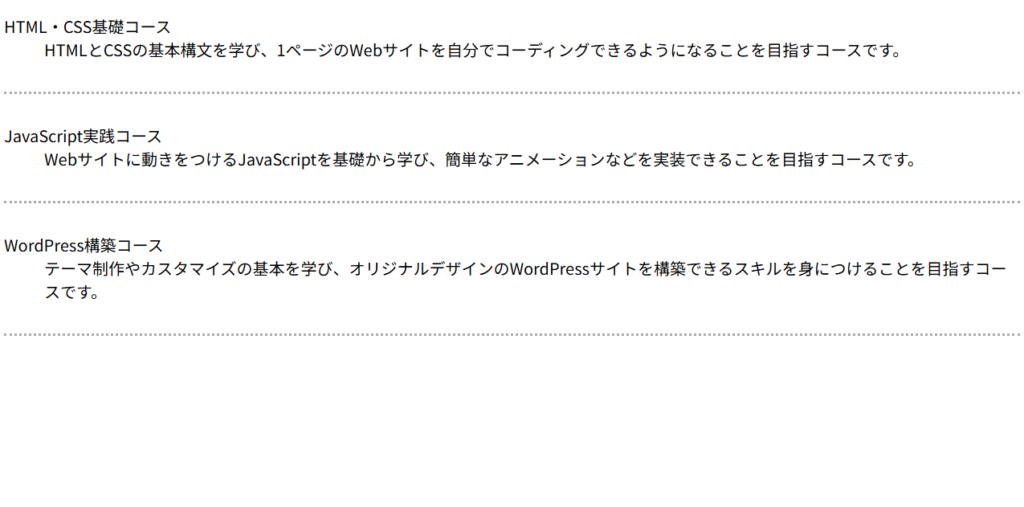 <dd>HTMLとCSSの基本構文を学び、1ページのWebサイトを自分でコーディングできるようになることを目指すコースです。</dd>