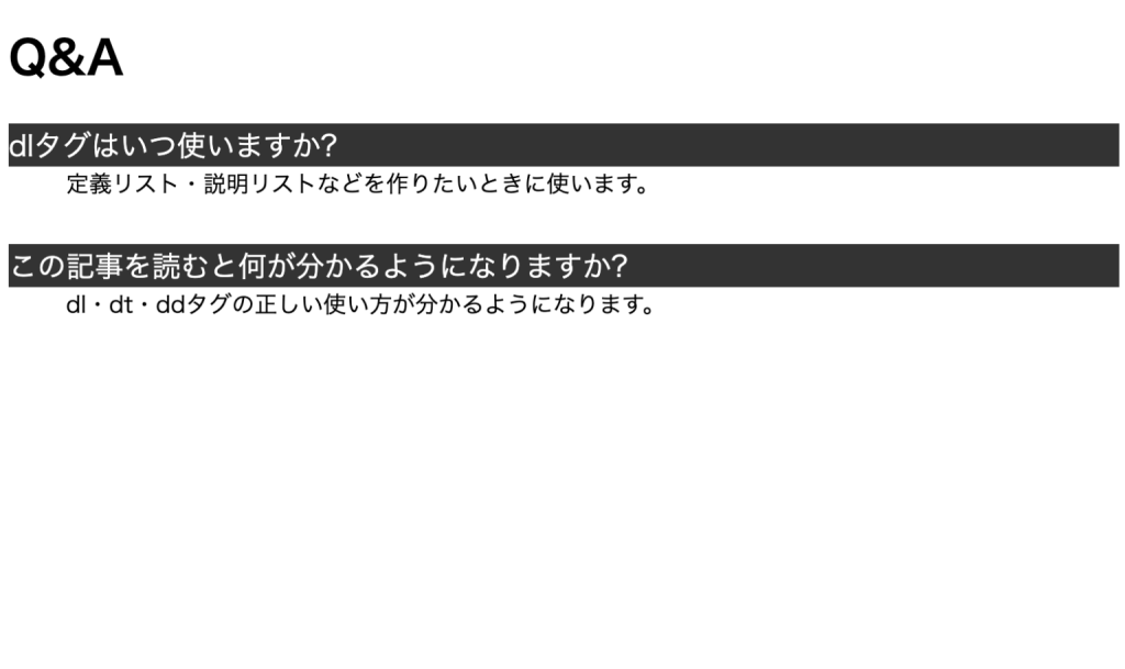 </dl><!-- 1つのdtタグに対して1つ以上のddタグが存在するパターン -->