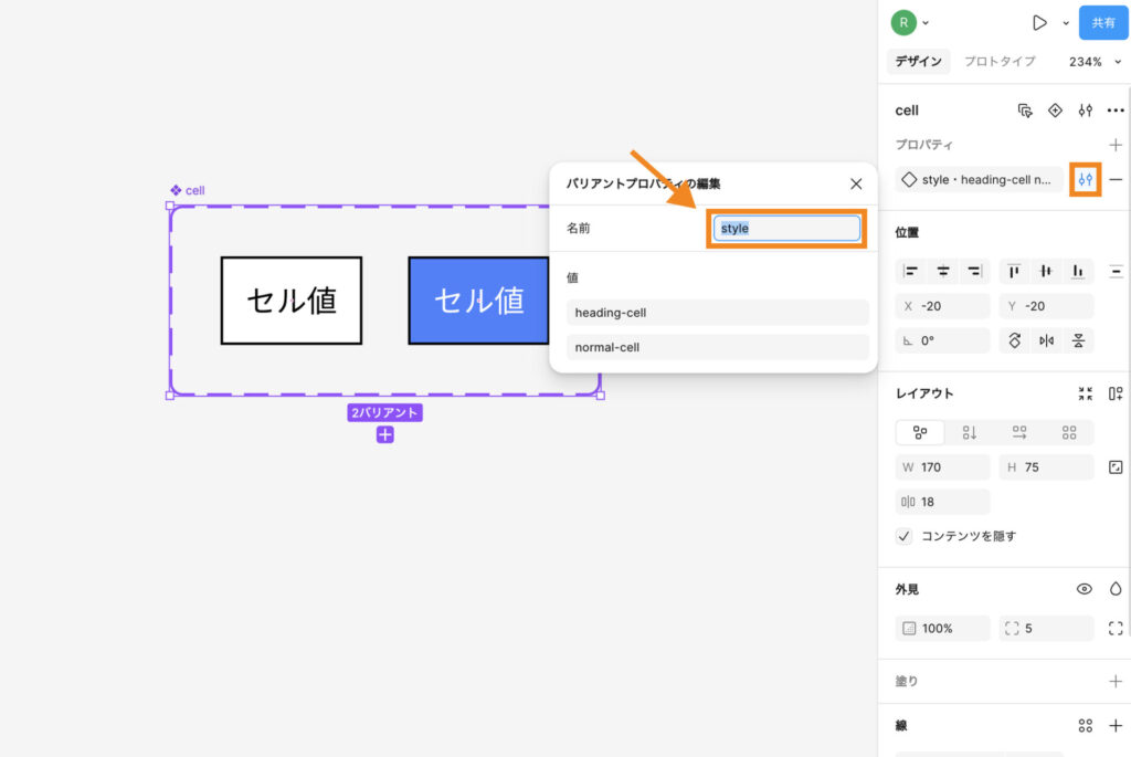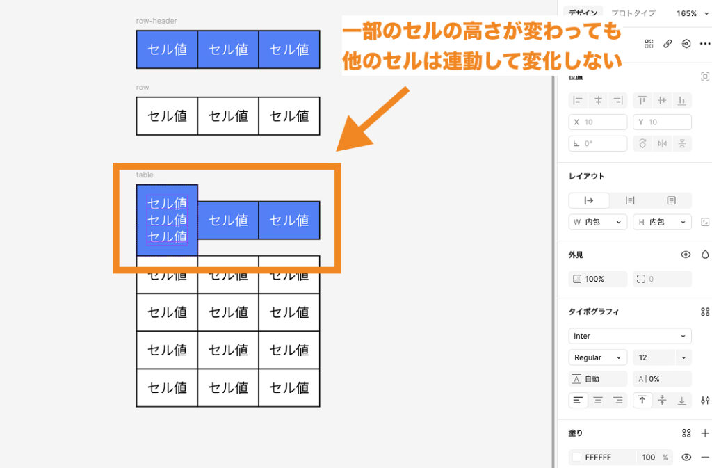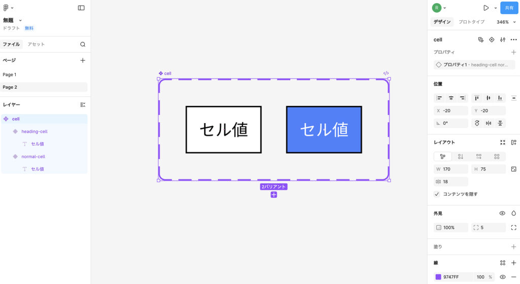 コンポーネントセット内で「通常のセル」と「見出し用のセル」のスタイルを定義しているため、テーブル上に配置したセルのインスタンスでは、プロパティを切り替えるだけで簡単に両者を切り替えられます。
