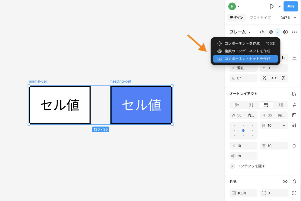 コンポーネントセットは、通常セルと見出しセルを選択した状態で「コンポーネントセットを作成」をクリックすることで作成できます。