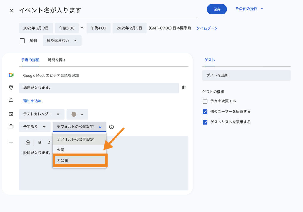 タイトルや時間、場所や説明文を記載して「保存」をクリックします。