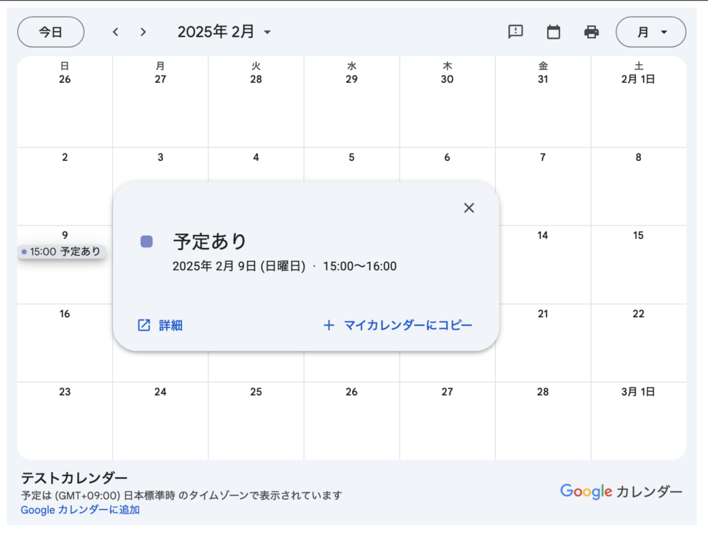 一方、「予定の表示(時間枠のみ、詳細は非表示)」と設定している場合は、「予定あり」とだけ表示され、詳細は伏せられるようになります。