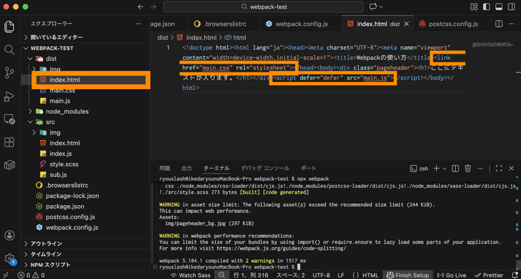 };これでnpx webpackコマンドを実行すると、dist/index.htmlが生成され、chunksで指定したエントリーポイントのJavaScriptファイルと、その中で読み込まれているSassファイルから生成されているCSSファイルが、自動で読み込まれていることが分かります。