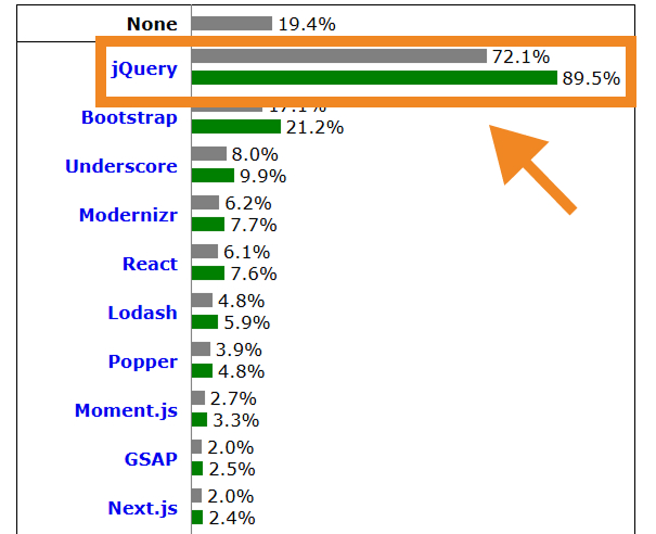 現在のモダン開発のトレンドとは言えないものの、依然としてWebサイトでの使用率は高く、Web制作の現場では今なお広く利用されています。