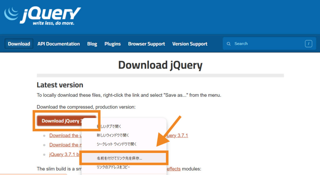 「Download jQuery」のリンクボタンの上で「右クリック>名前を付けてリンク先を保存」をクリックし、「jquery.min.js」と名前をつけて保存します。