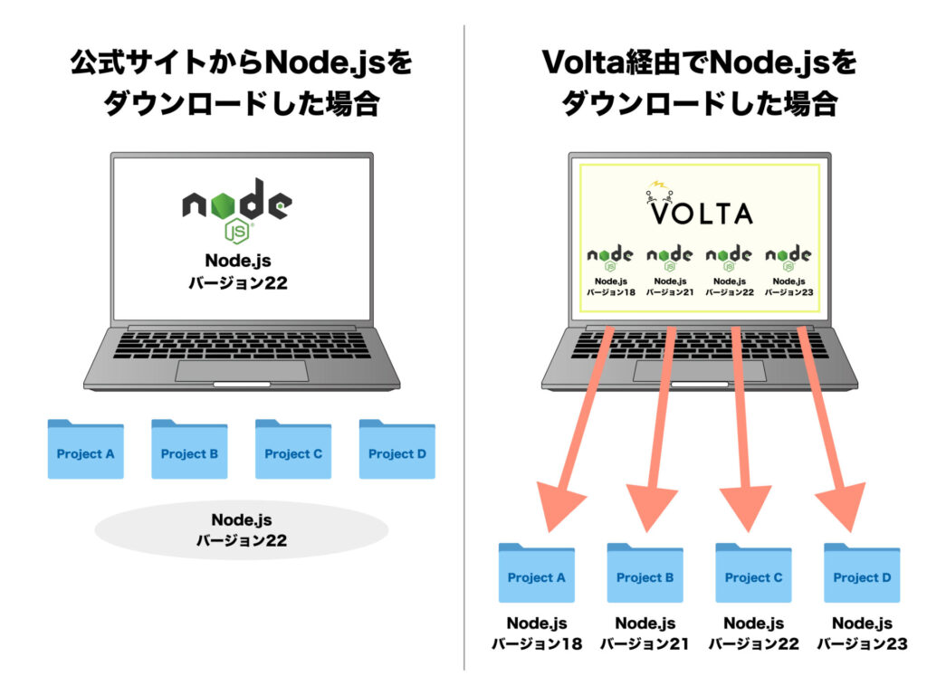 そのため、過去の案件で古いバージョンのNode.jsやnpmを使用していた場合でも、Voltaを使って当時の環境が固定されていれば、そのまま当時の開発環境を再現でき、環境差によるトラブルを防ぐことができます。