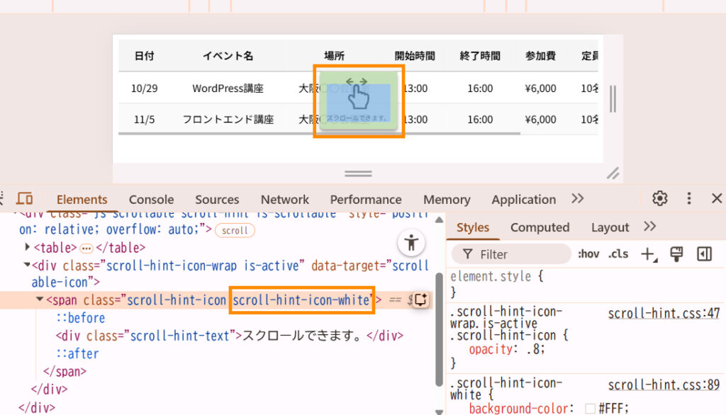 });これで、テーブルにスクロールヒントが表示されるようになりました。