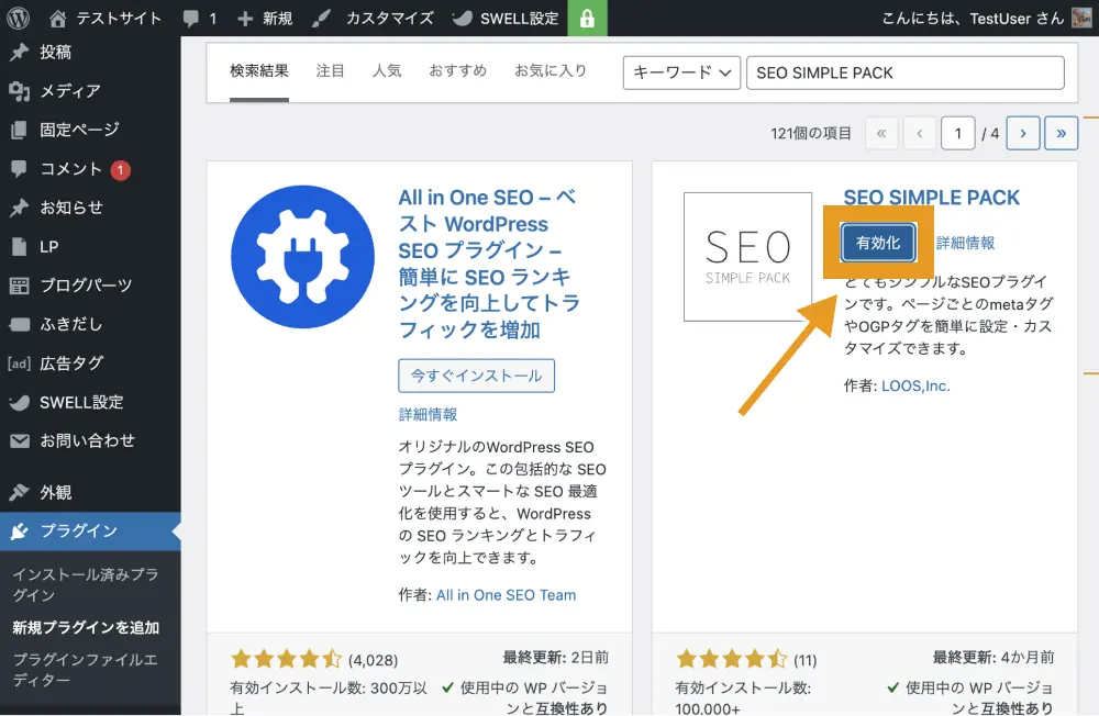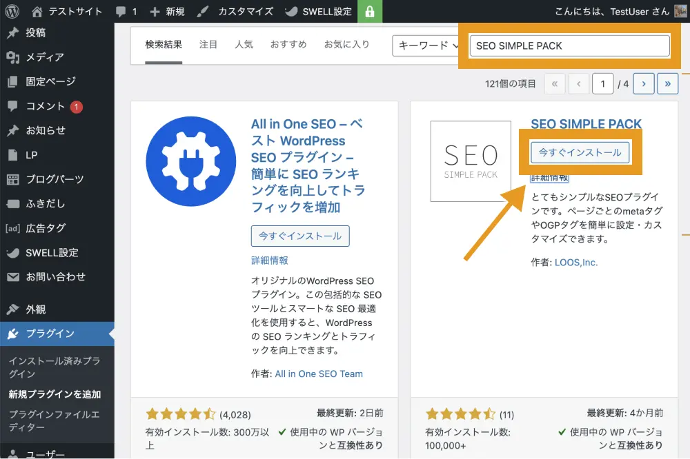 「SEO SIMPLE PACK」を検索し、出てきたこちらのプラグインをインストールします。
