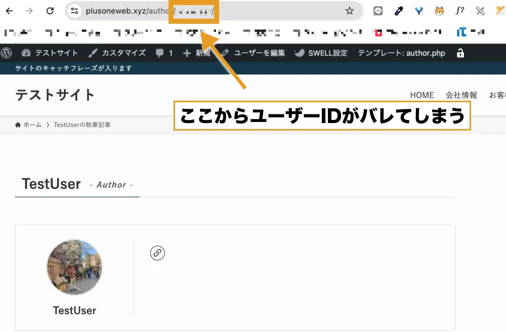 また、デフォルトでドメイン名の後ろに「/?author=1」とパラメーターをつけることで、誰でも著書のアーカイブページにアクセスできてしまいます。