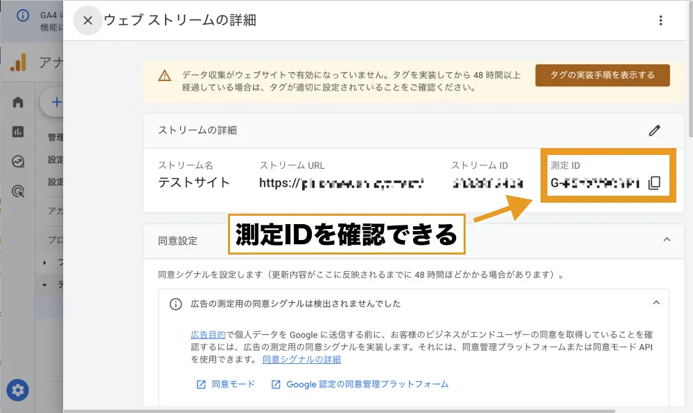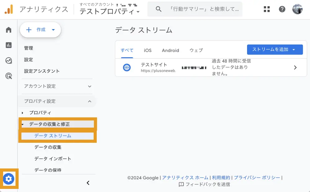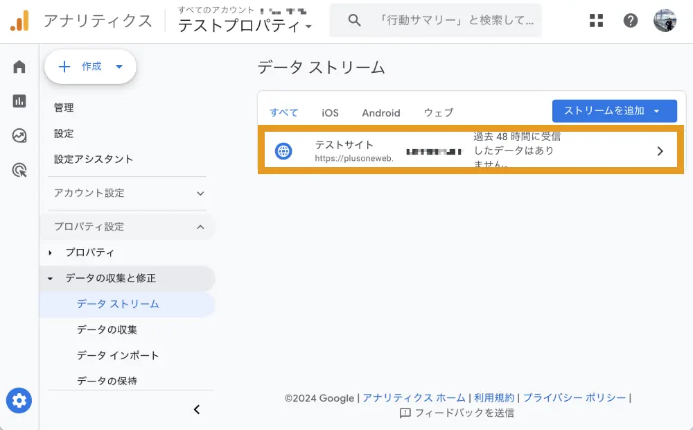 測定IDを確認するには、Googleアナリティクスの管理画面のプロパティ設定の中にある「データの収集と修正>データストリーム」をクリックします。