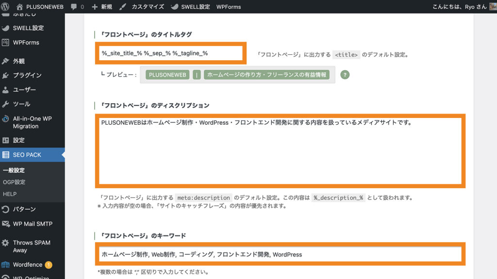 フロントページのタイトルタグやmeta description、meta keywordsの設定は、以下の部分より行います。