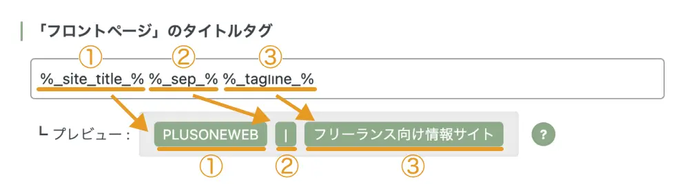 上の例では、タイトルタグにプラグインが用意しているスニペットタグ%_site_title_% %_sep_% %_tagline_%を記述していますが、こうすることで、サイトのタイトルや区切り文字が変更されても動的に内容が変更されるようになります。