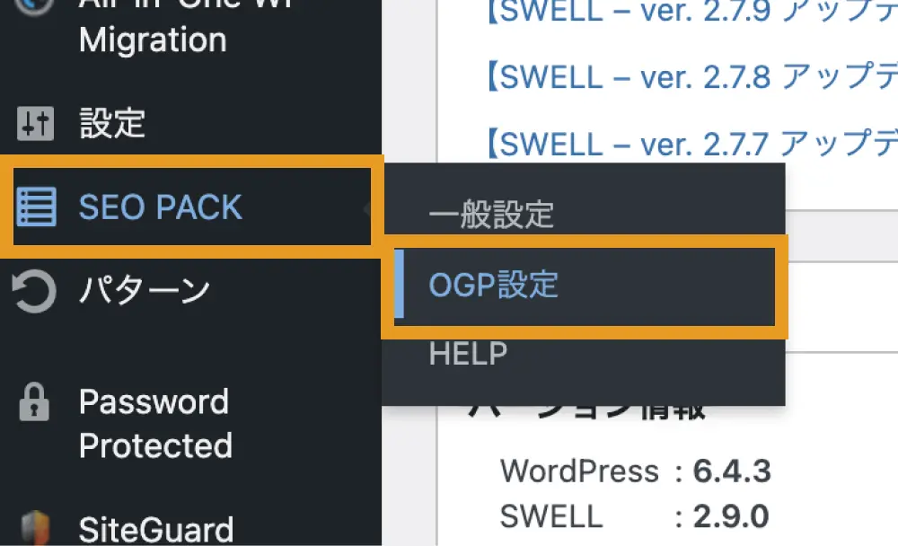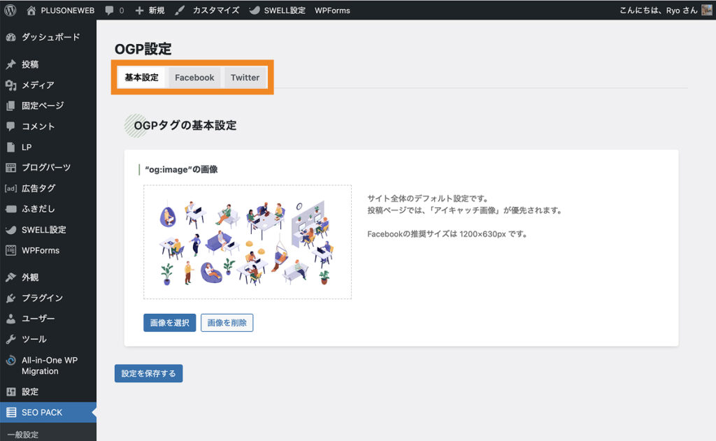 WebページがSNSでシェアされた際の表示画面の設定は、「SEO PACK>OGP設定」から設定できます。